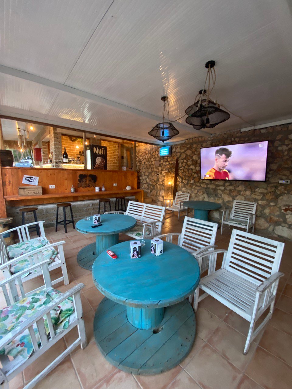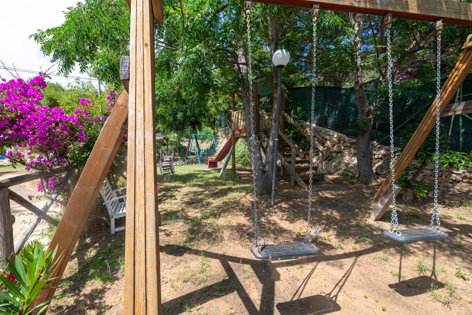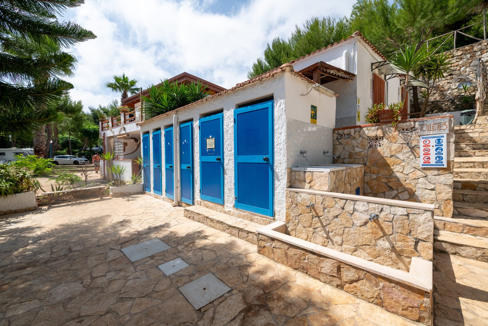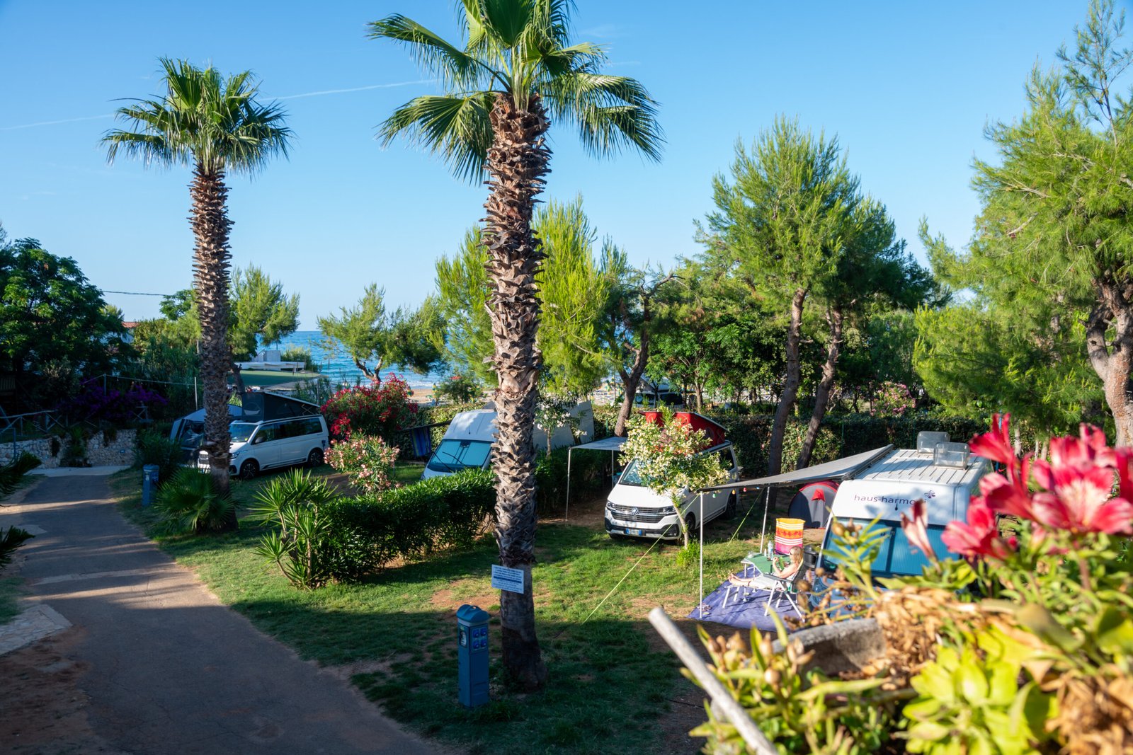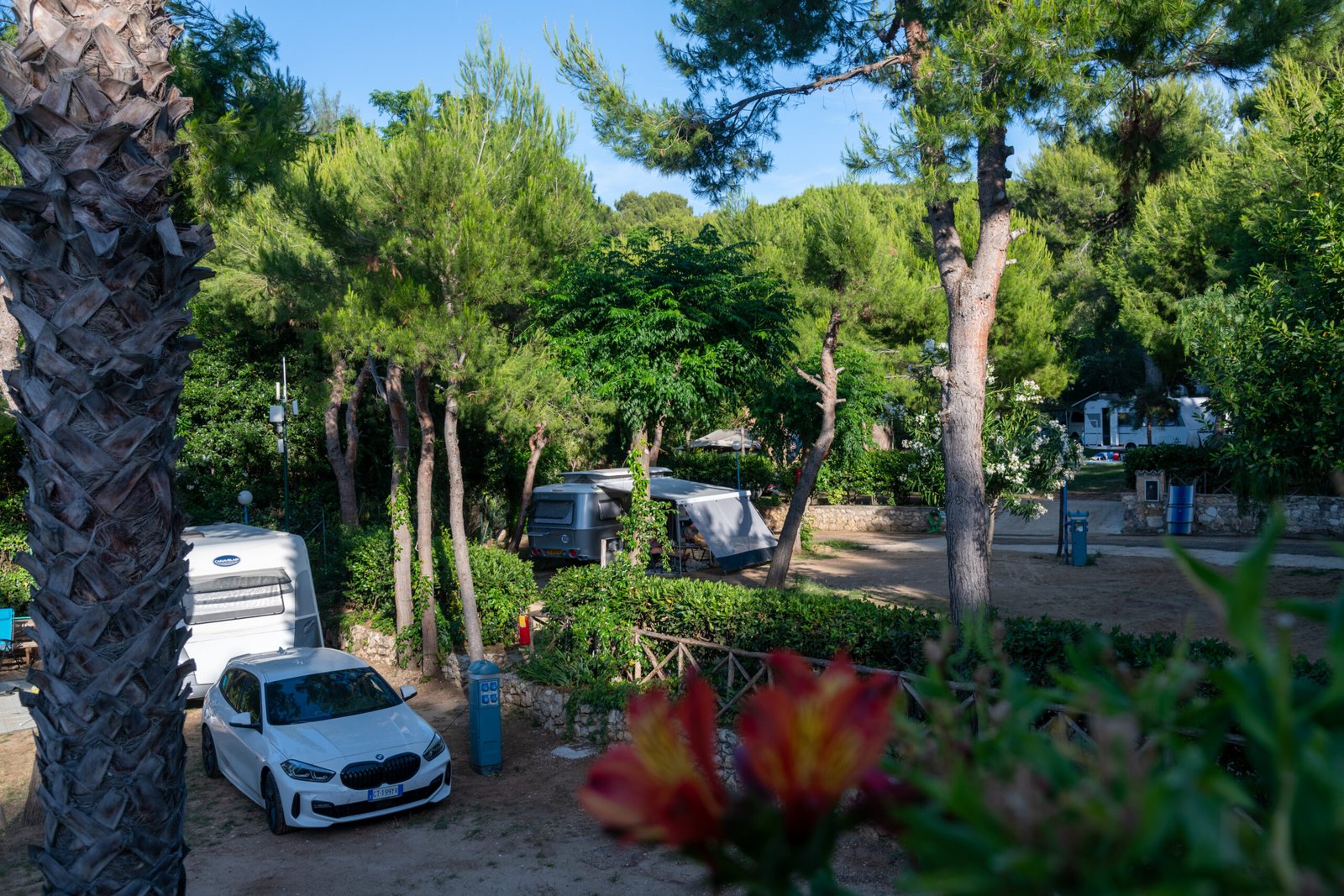 All’ombra di pini e palme: l’area è scenografica e fresca anche nei mesi più caldi, con un’atmosfera tipica della macchia mediterranea.