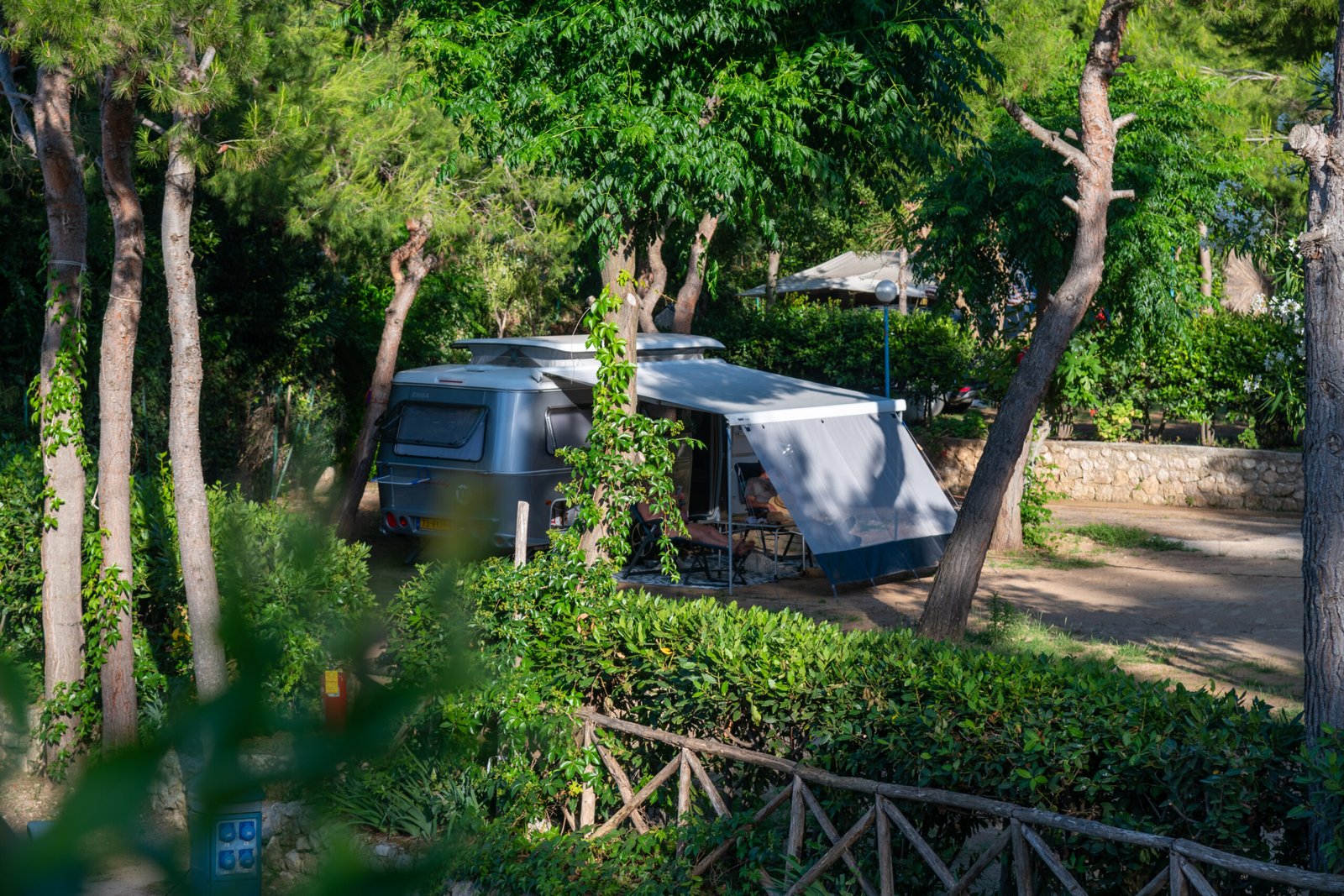 Molte sono disposte su terrazze naturali sotto gli alberi, ideali per tende, caravan o camper e garantiscono ombra naturale e un bel contesto verde.